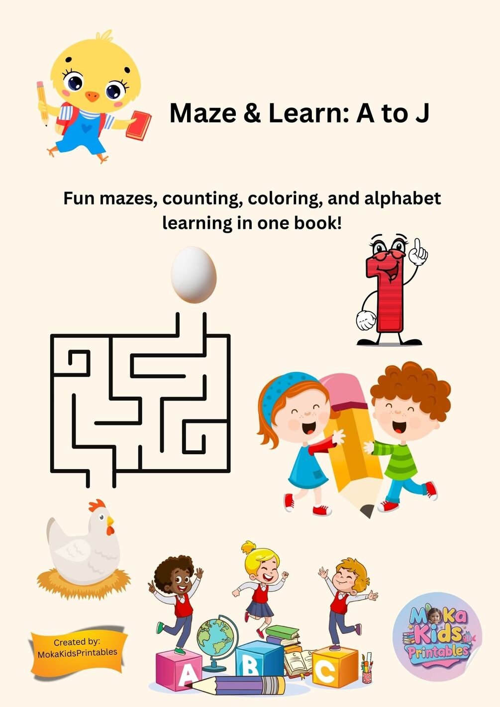 Fun A–J alphabet activities! Mazes, counting, coloring & phonics in a 23-page printable pack for preschool kids